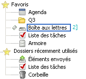Favoris : s'affiche lorsque vous ne vous trouvez pas dans le dossier Agenda, Contacts ou Documents, ni dans aucun des dossiers NNTP ou flux RSS. La liste des dossiers simple des Favoris permet de copier des dossiers dans la liste des dossiers pour y accéder plus rapidement.