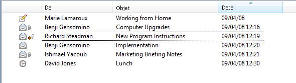 La liste des éléments d'un dossier est divisée en colonnes. Les informations relatives aux éléments de cette liste apparaissent dans chaque colonne. Par exemple, l'objet et la date d'envoi apparaissent dans des colonnes différentes. Vous pouvez personnaliser l'affichage des colonnes de chaque dossier.