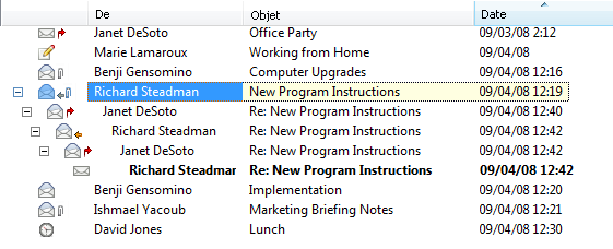 Suivis de discussion affiche les échanges électroniques d'un élément d'origine ainsi que toutes les réponses qui lui ont été faites sous forme de groupes hiérarchisés. Par défaut, seuls les éléments reçus sont affichés dans un suivi de discussion.