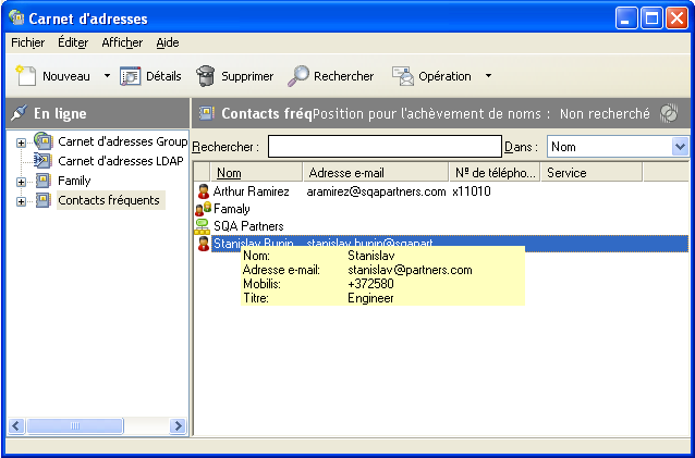 dans la barre d'outils de la fenêtre principale. Le volet gauche affiche les carnets d'adresses GroupWise, LDAP, Contacts fréquents et personnels que vous avez créés.