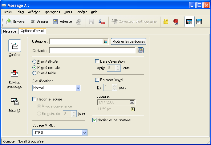 Si vous envoyez des messages vers des systèmes non-GroupWise, notez que ces derniers doivent disposer d'une fonctionnalité de suivi de processus afin de pouvoir renvoyer l'état de votre message sortant à votre système GroupWise.