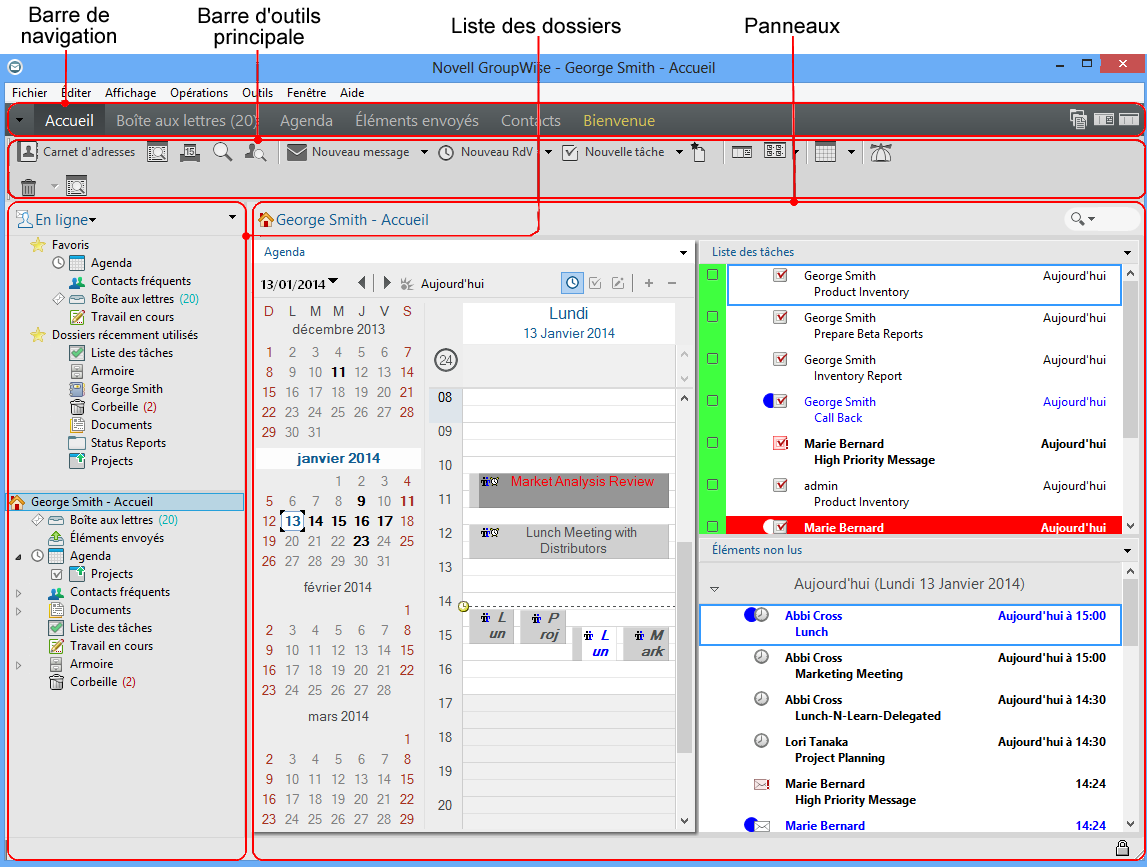 Dans GroupWise, la zone de travail principale est appelée « fenêtre principale ». À partir de la fenêtre principale, vous pouvez lire vos messages, planifier vos rendez-vous, afficher votre agenda, gérer les contacts, modifier le mode d'exécution de GroupWise, ouvrir des dossiers ou des documents, et bien plus encore.