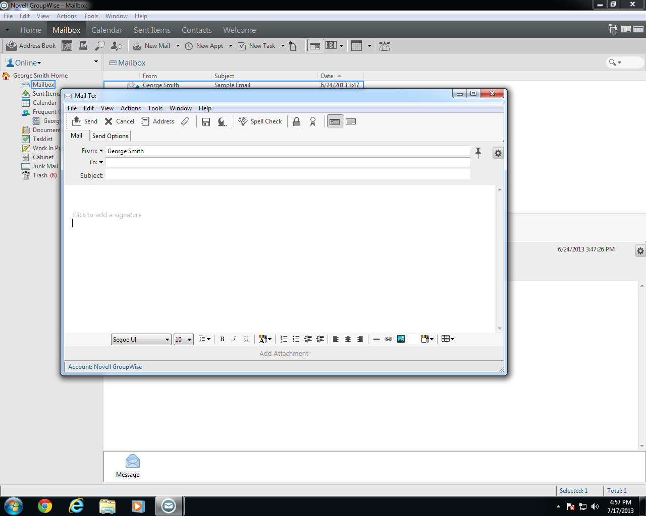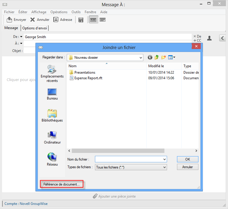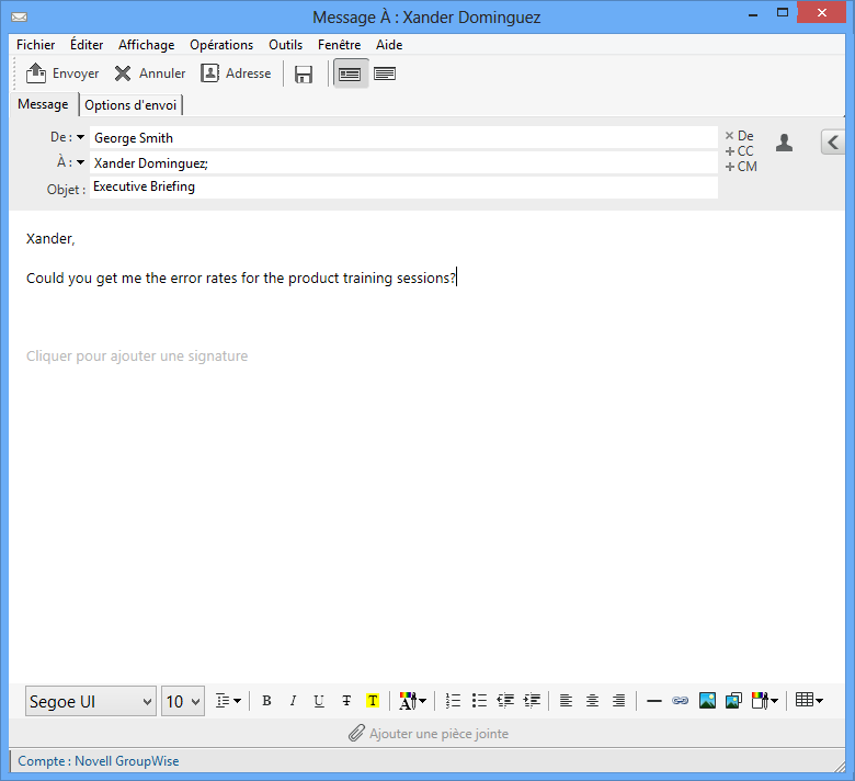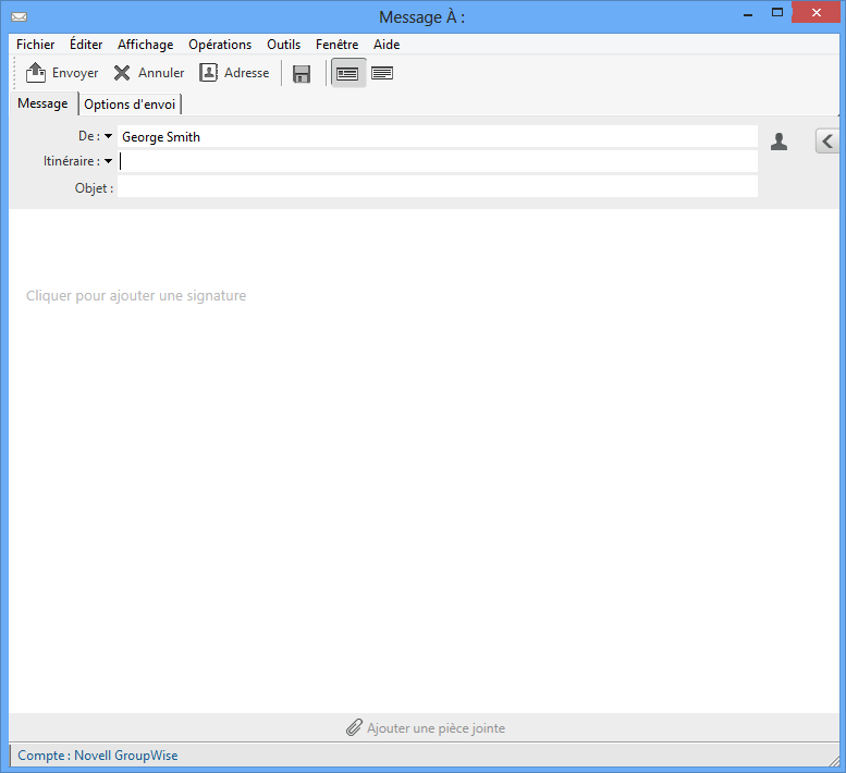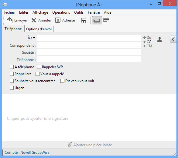 Lorsque vous envoyez un message électronique à partir de GroupWise, vous pouvez le faire au format texte ou HTML. En outre, vous pouvez choisir de joindre un fichier, d'ajouter une signature ou une vCard au message et d'effectuer une vérification orthographique du message avant de l'envoyer.