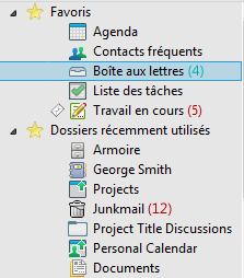 Favoris : s'affiche lorsque vous ne vous trouvez pas dans le dossier Agenda, Contacts ou Documents, ni dans aucun des dossiers NNTP ou flux RSS. La liste des dossiers simple des Favoris permet de copier des dossiers dans la liste des dossiers pour y accéder plus rapidement.