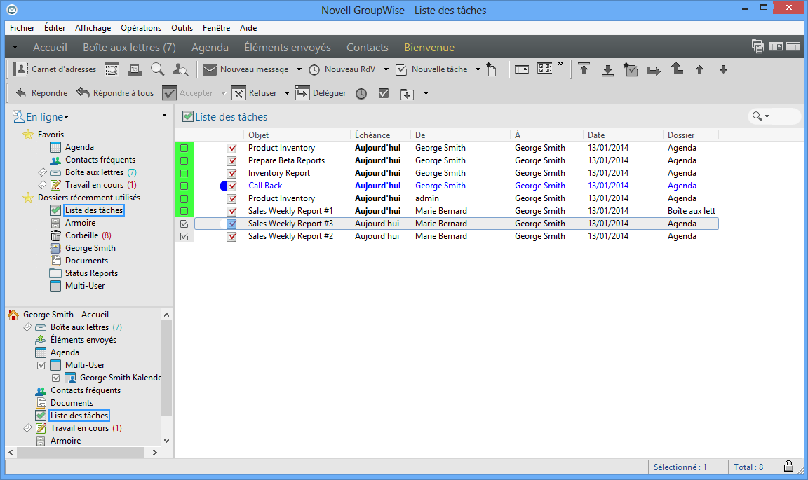 Le dossier Liste des tâches est un dossier système utilisé pour suivre les tâches de GroupWise et les autres éléments nécessitant une opération. Vous pouvez le considérer comme la liste principale de toutes vos tâches.
