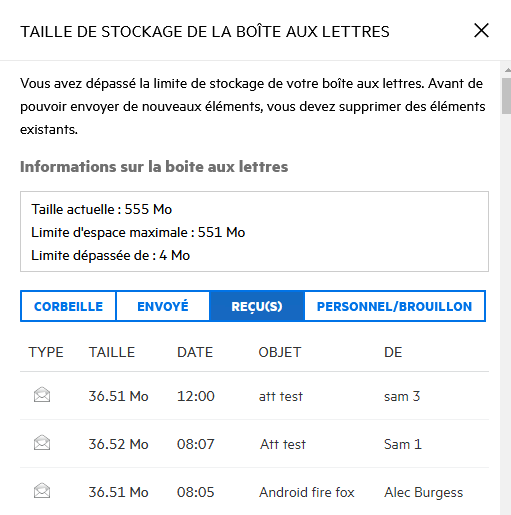 Rouge : la limite de stockage de votre boîte aux lettres a été dépassée. Vous ne pouvez plus envoyer de messages tant que vous n'avez pas fait le nécessaire pour réduire la taille de la boîte aux lettres.