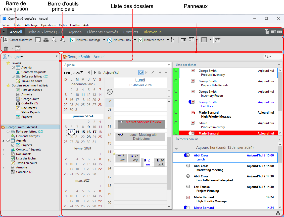 Dans GroupWise, la zone de travail principale est appelée « fenêtre principale ». À partir de la fenêtre principale, vous pouvez lire vos messages, planifier vos rendez-vous, afficher votre agenda, gérer les contacts, modifier le mode d'exécution de GroupWise, ouvrir des dossiers ou des documents, et bien plus encore.