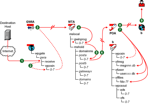 This message flow diagram illustrates how inbound message flow from the Internet through the GroupWise directory structure to the GroupWise recipient. The link between the Internet Agent and the MTA for the recipient’s domain is a TCP/IP link.