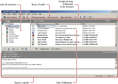L'Aperçu s'ouvre sous l'en-tête des dossiers et des listes d'éléments. Il permet d'analyser rapidement les éléments et leurs pièces jointes sans avoir à ouvrir chaque élément dans une fenêtre différente. Pour plus d'informations sur l'Aperçu, reportez-vous à Lecture des éléments dans l'Aperçu.
