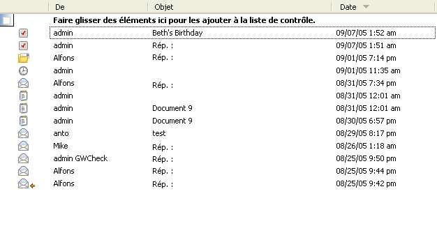 Tous les éléments que vous recevez ou que vous envoyez sont conservés dans votre Boîte aux lettres GroupWise. Pour afficher rapidement uniquement les éléments reçus, les éléments envoyés, les éléments publiés ou les brouillons, cliquez sur le paramètre correspondant dans la liste déroulante Affichage. L'utilisation de filtres permet de restreindre davantage le type d'éléments qui apparaît dans votre Boîte aux lettres. Pour plus d'informations, reportez-vous au Section 6.0, Gestion de la boîte aux lettres.