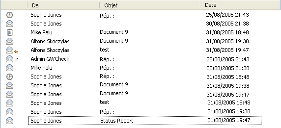L'option Détails affiche une liste des éléments et des informations connexes dans des colonnes, à savoir Objet, Date, CC, Priorité, Type de document, Échéance, Taille, Version# et plusieurs autres catégories. Détails représente la vue par défaut de la boîte aux lettres si vous n'avez pas changé les propriétés de cette dernière. Pour plus d'informations sur l'ajout ou la réorganisation de colonnes, reportez-vous à la Section 6.16, Utilisation des colonnes de votre boîte aux lettres.