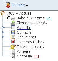 L'en-tête Liste des dossiers inclut le sélecteur de mode, lequel permet de basculer entre le mode En ligne et le mode Caching. Certains dossiers sont disponibles par défaut. D'autres dossiers sont créés lorsque vous utilisez des fonctions supplémentaires de GroupWise.