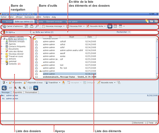 Dans GroupWise, la zone de travail principale est appelée « fenêtre principale ». À partir de la fenêtre principale de GroupWise, vous pouvez lire vos messages, planifier vos rendez-vous, afficher votre Agenda, gérer les contacts, modifier le mode d'exécution de GroupWise, ouvrir des dossiers ou des documents, etc.