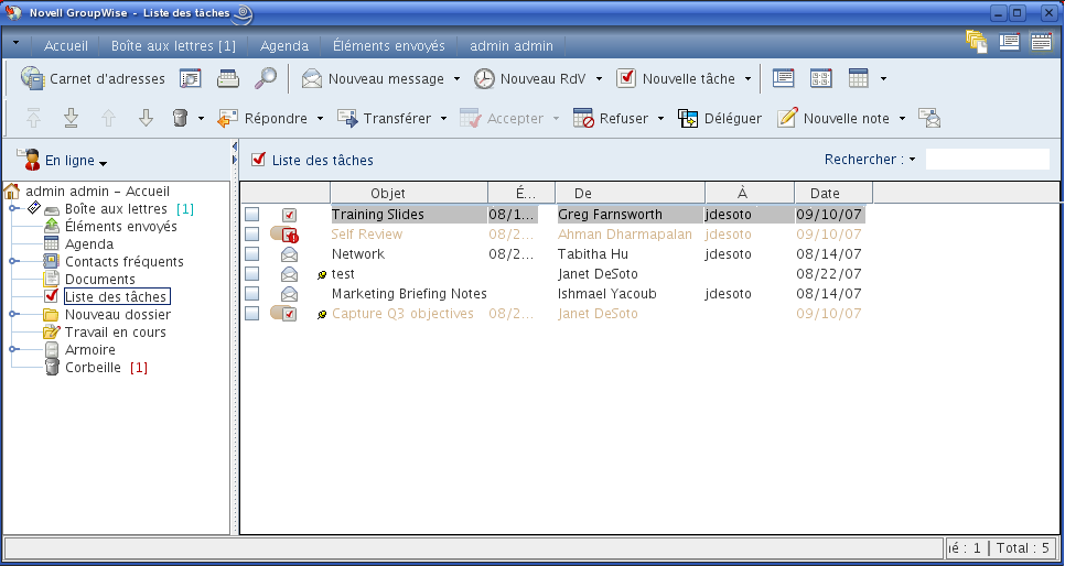 REMARQUE :la liste des tâches remplace le dossier Liste de contrôle des versions précédentes de GroupWise. Pour une comparaison entre le dossier Liste des tâches et le dossier Liste de contrôle, reportez-vous à Dossier Liste des tâches.