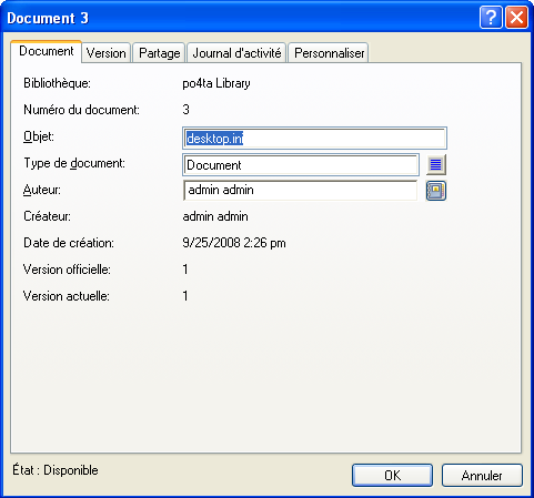 Vous pouvez utiliser l'onglet Document dans Propriétés pour afficher les informations relatives à une version spécifique d'un document, l'historique des activités effectuées sur le document et pour contrôler son partage entre les utilisateurs.