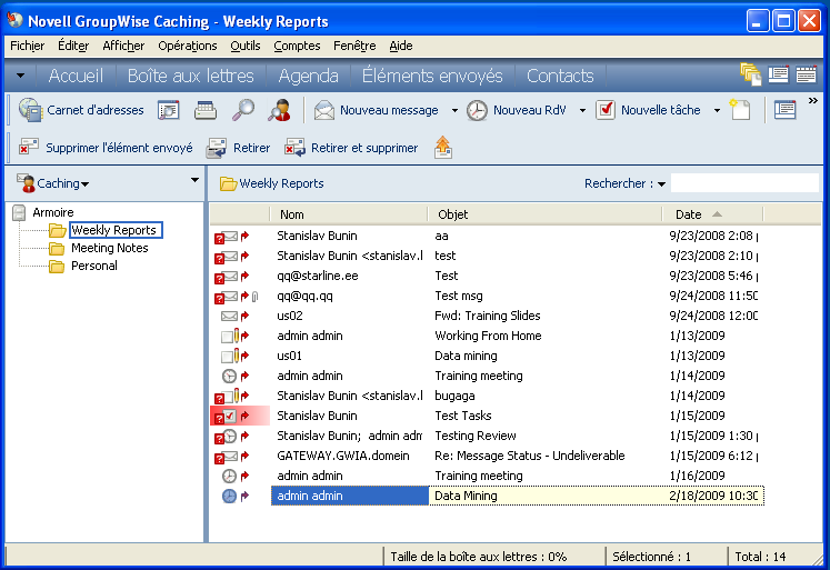 Dans GroupWise, vos documents apparaissent dans votre boîte aux lettres et dans vos dossiers comme tous les autres éléments, tels que vos messages électroniques, vos tâches, vos rendez-vous.