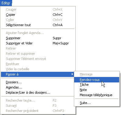 Vous pouvez utiliser Passer à pour convertir un élément de votre boîte aux lettres en un autre type d'élément. Vous pouvez, par exemple, transformer un message électronique de votre boîte aux lettres en rendez-vous dans votre agenda. Le nouveau rendez-vous contient toutes les informations du message électronique (telles que les zones , et , l'objet et le texte du message) applicables au rendez-vous.