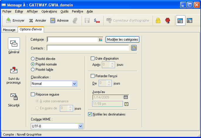 Si vous envoyez des messages vers des systèmes non-GroupWise, notez que ces derniers doivent disposer d'une fonctionnalité de suivi de processus afin de pouvoir renvoyer l'état de votre message sortant à votre système GroupWise.