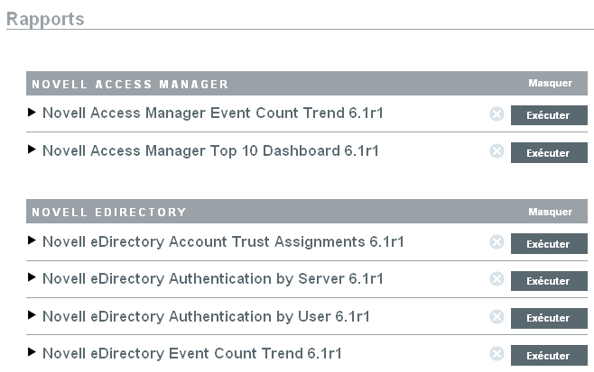 Identity Audit est installé avec un jeu de modèles de rapport liés aux applications Novell. Tous les utilisateurs Identity Audit peuvent exécuter un rapport en utilisant les paramètres qu'ils souhaitent (tels que les dates de début et de fin) et en enregistrer les résultats sous le nom de leur choix. Une fois le rapport exécuté, les résultats peuvent être récupérés par tout utilisateur Identity Audit et affichés sous la forme d'un fichier PDF.