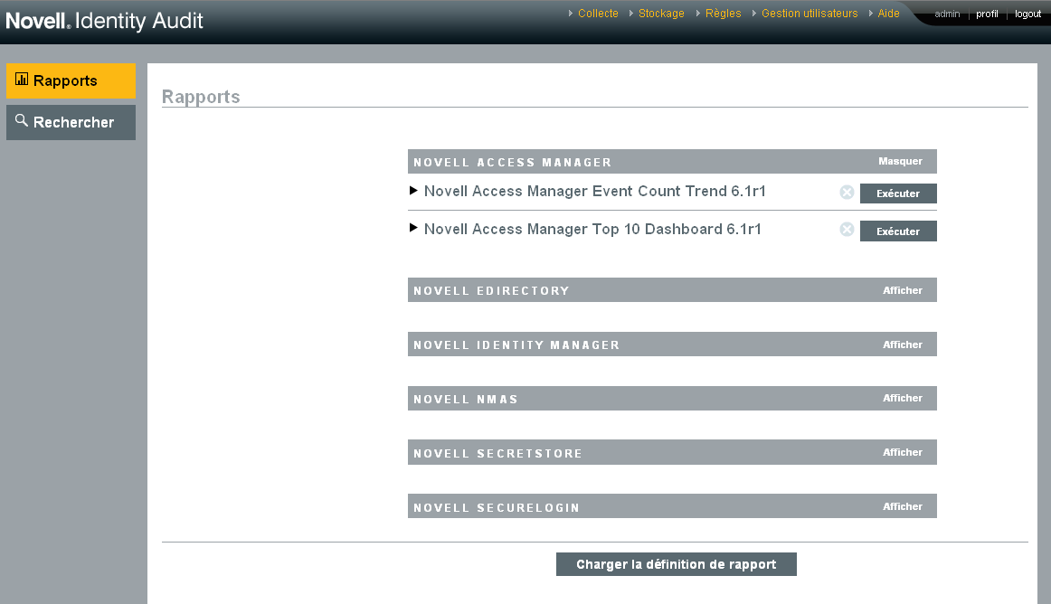 Figure 1-1 Interface de Novell Identity Audit (vue de l'administrateur)