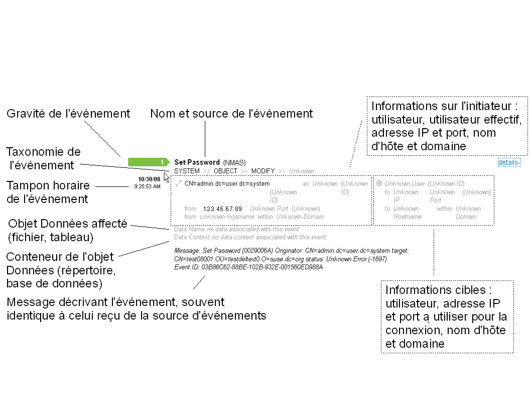 Les informations de base concernant un événement incluent le nom de l'événement, la source, l'heure, la gravité, des informations sur l'initiateur (représenté par une flèche) et des information sur la cible (représentée par des yeux de taureau).