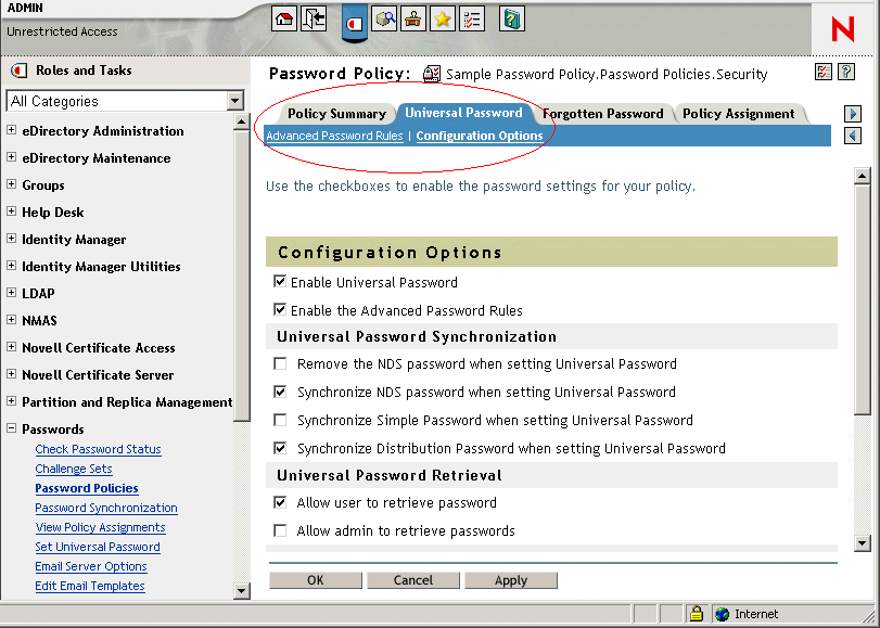 Mot de passe universel (réversible) ou mot de passe de distribution (réversible également). Si on le souhaite, le mot de passe NDS peut rester synchronisé. Pour consulter des exemples de scénarios, reportez-vous à la Section 5.8, Implémentation de la synchronisation des mots de passe. |