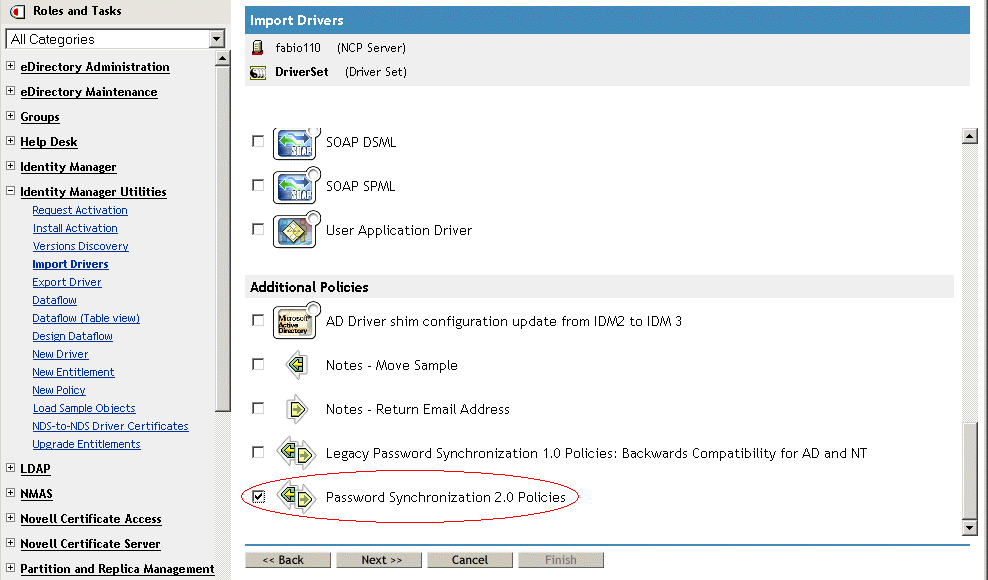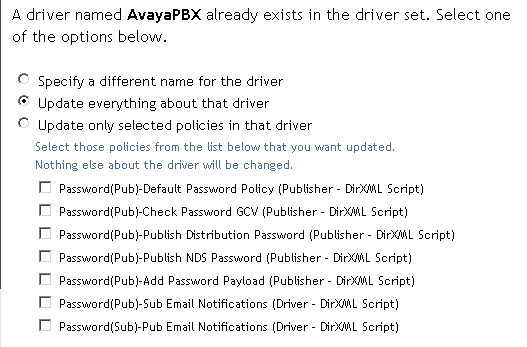 IMPORTANT:si vous mettez à niveau un pilote Identity Manager pour AD ou NT Domain, et si ce pilote est utilisé avec la version 1.0 de la synchronisation des mots de passe, n'installez pas le module d'interface pilote avant d'avoir consulté les instructions de mise à niveau. Suivez les instructions de mise à niveau que vous trouverez dans les guides d'implémentation de chaque pilote Identity Manager pour Active Directory et NT Domain, disponibles à la page Identity Manager Drivers (Pilotes Identity Manager).
