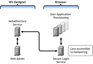 In Figure 1-3, we recommend one server for the Metadirectory service, one server for the Web-based administration service, one server for the secure logging service, and one server for user application and workflow-based provisioning service.