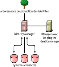 Le coffre-fort d'identité contient les données de l'utilisateur ou de l'objet que vous voulez partager ou synchroniser avec d'autres systèmes connectés. Il est conseillé d'installer Identity Manager dans sa propre instance eDirectory™ et de l'utiliser comme coffre-fort d'identité.
