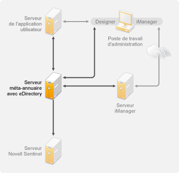 Votre solution Identity Manager peut être dotée d'un ou plusieurs serveurs méta-annuaires, ceci dépendant de la charge du serveur. Le serveur méta-annuaire nécessite l'installation de eDirectory, comme indiqué dans la Figure 3-3. Pour faciliter la charge ou la configuration de votre environnement, vous pouvez ajouter un serveur de chargeur distant, qui n'est pas représenté dans la figure.