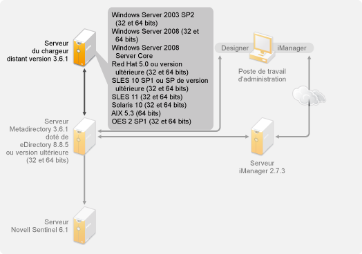 Le chargeur distant vous apporte de la flexibilité pour la configuration de votre solution Identity Manager. Il propose une prise en charge de 32 ou 64 bits. Par défaut, le programme d'installation détecte la version du système d'exploitation, puis installe la version correspondante du chargeur distant. Pour installer le chargeur distant 32 bits sur un système d'exploitation 64 bits, reportez-vous à Installation du chargeur distant 32 bits sur un système d'exploitation 64 bits. La Figure 6-4 liste les systèmes d'exploitation pris en charge pour le chargeur distant.