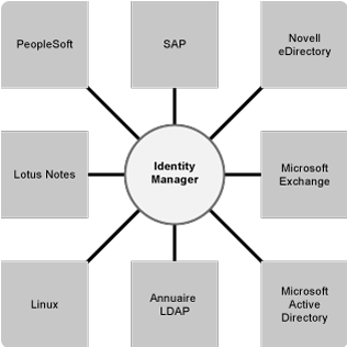 Identity Manager permet de synchroniser, de transformer et de distribuer les informations à l'échelle d'une grande variété d'applications, de bases de données, de systèmes d'exploitation et d'annuaires tels que SAP*, PeopleSoft*, Lotus Notes*, Microsoft* Exchange, Microsoft Active Directory*, Novell eDirectory™, Linux, UNIX et les annuaires LDAP.