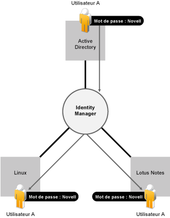 Dans le cadre de ses fonctions de synchronisation des données, Identity Manager peut également vous aider à synchroniser des mots de passe entre systèmes. Par exemple, si un utilisateur modifie son mot de passe dans Active Directory, Identity Manager peut le synchroniser dans Lotus Notes et Linux.