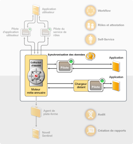Coffre-fort d'identité : il sert de méta-annuaire pour les données à synchroniser entre les applications. Par exemple, les données synchronisées d'un système PeopleSoft vers Lotus Notes sont d'abord ajoutées au coffre-fort d'identité, puis envoyées au système Lotus Notes. Par ailleurs, le coffre-fort d'identité stocke les informations spécifiques à Identity Manager, telles que la configuration, les paramètres et les stratégies des pilotes. Novell eDirectory™ intervient pour le coffre-fort d'identité.