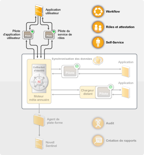 Application utilisateur : il s'agit d'une application basée sur navigateur offrant aux utilisateurs et aux administrateurs la possibilité d'effectuer un grand nombre de tâches de self-service d'identité et de provisioning de rôle, notamment la gestion des mots de passe et des données d'identité, le démarrage et le suivi des requêtes de provisioning et d'assignation de rôle, la gestion du processus d'approbation des requêtes de provisioning, ainsi que la vérification des rapports d'attestation. Elle inclut le moteur de workflow qui permet l'acheminement des requêtes tout au long du processus d'approbation approprié.