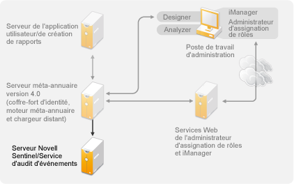 Le module Identity Reporting est un composant d'Identity Manager Advanced Edition. Novell Sentinel est un composant facultatif qui n'est pas fourni avec Identity Manager, mais que vous pouvez ajouter à votre système Identity Manager.