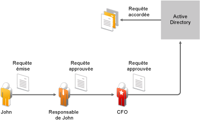 Non seulement John utilise la fonction de self-service d'Identity Manager pour demander l'accès aux documents dont il a besoin, mais le responsable de John et le directeur financier utilisent la fonction de self-service pour approuver cette demande. Le workflow d'approbation établi permet à John de lancer sa demande et d'en suivre la progression. Il permet également au responsable de John et au directeur financier d'y répondre. L'approbation de la requête par le responsable de John et le directeur financier déclenche le provisioning des droits d'Active Directory dont John a besoin pour accéder aux documents financiers et les consulter.