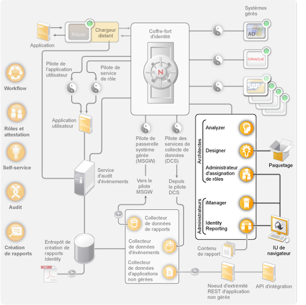 Designer permet de concevoir, de créer et de configurer votre système Identity Manager dans un environnement hors ligne, puis de déployer vos modifications dans votre système en ligne. Analyzer permet, lors de la création de votre solution Identity Manager, d'analyser, de nettoyer et de préparer vos données à des fins de synchronisation.