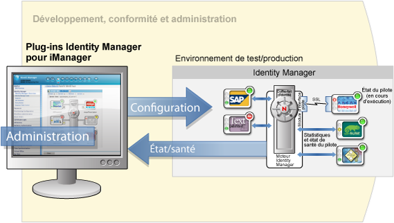 Novell iManager est un outil basé sur un navigateur qui offre un point d'administration unique pour un grand nombre de produits Novell, notamment Identity Manager. En utilisant les plug-ins d'Identity Manager pour iManager, vous pouvez gérer Identity Manager et recevoir des informations en temps réel sur la santé et l'état de votre système Identity Manager.