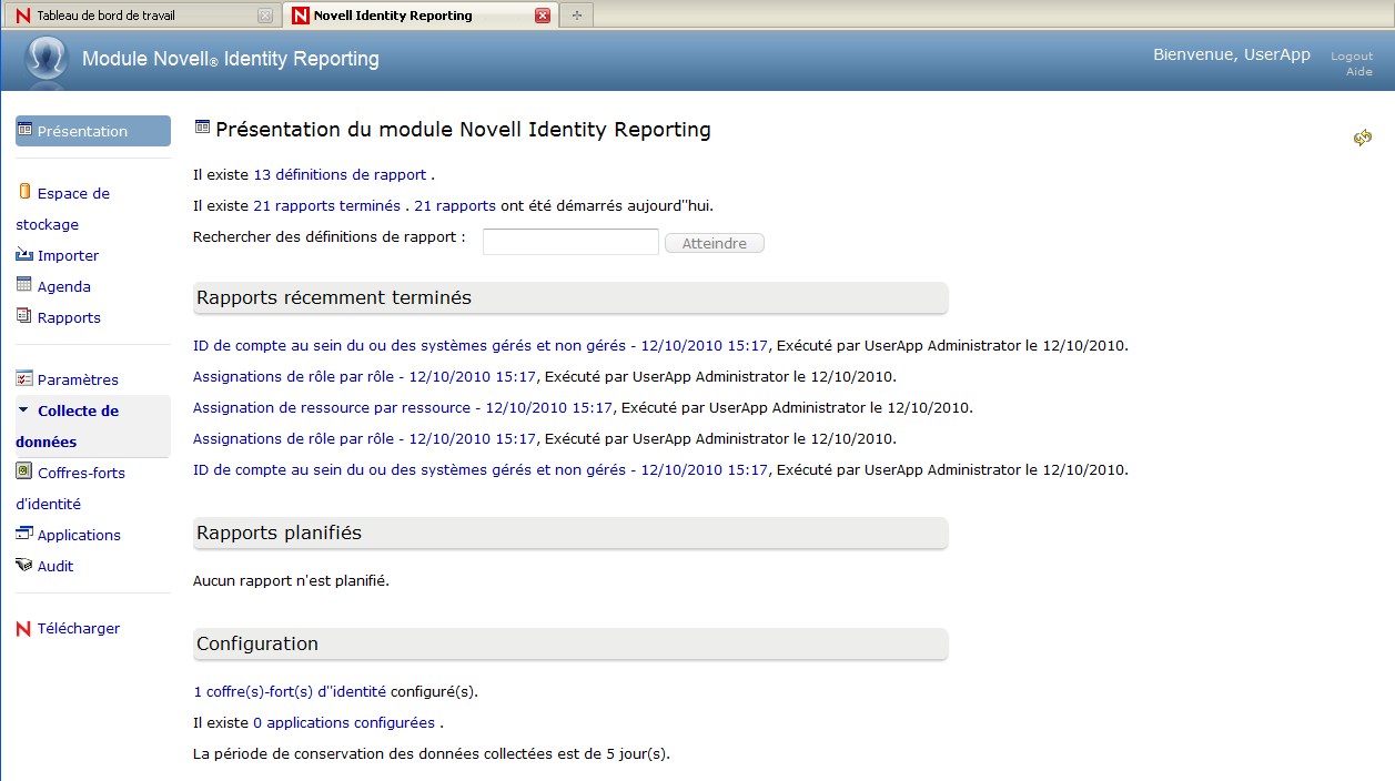 Le module Identity Reporting génère des rapports qui fournissent des informations essentielles sur divers aspects de votre configuration Identity Manager, notamment les données collectées auprès de coffres-forts d'identité et de systèmes gérés tels qu'Active Directory ou SAP. Le module de création de rapports comprend un ensemble de définitions de rapport prédéfinies que vous pouvez utiliser pour générer des rapports. En outre, il permet d'importer des rapports personnalisés définis dans un outil tiers. L'interface utilisateur du module de création de rapports permet de planifier facilement l'exécution des rapports aux heures creuses de manière à optimiser les performances.