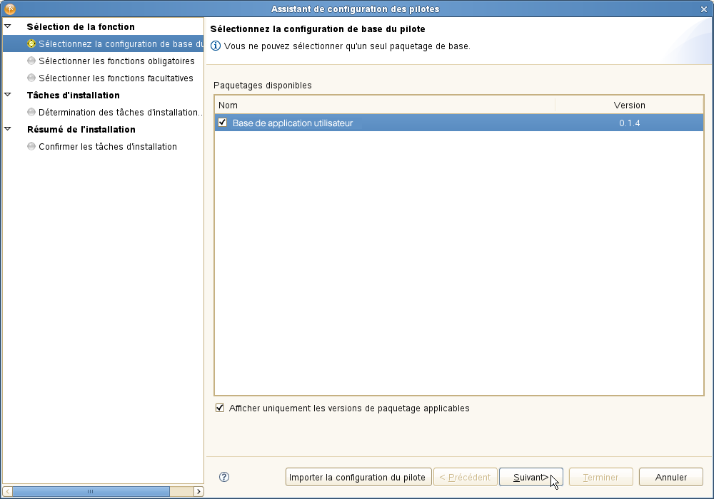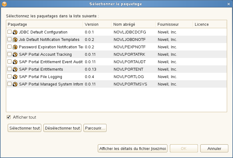 Avant toute tentative de configuration des pilotes, assurez-vous que vous disposez bien de tous les paquetages nécessaires dans le catalogue de paquetages. Lors de la création d'un nouveau projet Identity Manager, l'interface utilisateur vous invite automatiquement à importer plusieurs paquetages dans le nouveau projet. Si vous décidez de ne pas les importer à ce moment-là, vous devrez les installer par la suite, comme décrit ci-dessous.