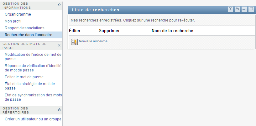 Figure 6-5 Recherches enregistrées, sur la page Liste de recherches