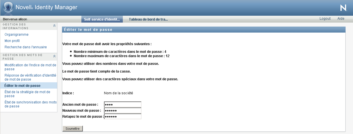Vous serez invité à fournir un indice de mot de passe, si la stratégie de sécurité configurée par votre administrateur l'indique. Si c'est le cas, reportez-vous à la Section 7.3, Modification de l'indice du mot de passe.