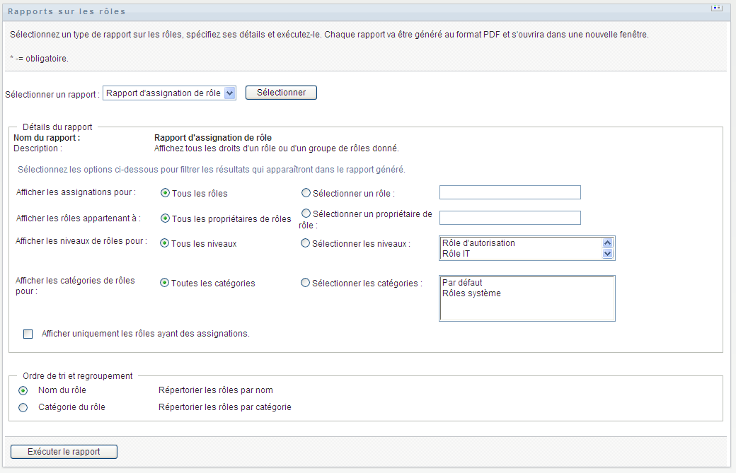 Sélectionnez dans le menu déroulant , puis cliquez sur . La page Rapports sur les rôles vous invite à sélectionner les paramètres à inclure dans le rapport.