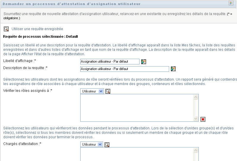 Vous devez sélectionner au moins un utilisateur, un groupe ou un rôle de chargé d'attestation avant de lancer un processus d'attestation. En revanche, il n'est pas obligatoire de sélectionner un chargé d'attestation pour enregistrer une requête.