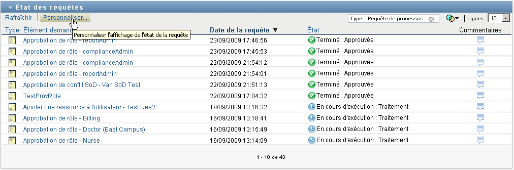 L'opération comprend des requêtes de processus (provisioning), des requêtes de rôles et des requêtes de ressources dans une seule liste consolidée. La liste fournit une colonne qui vous permet de voir le type de chaque requête. Les requêtes apparaissent dans une seule liste, mais celle-ci peut être triée ou filtrée par type de requête. Vous pouvez retirer de la liste des requêtes qui présentent encore un état retirable.