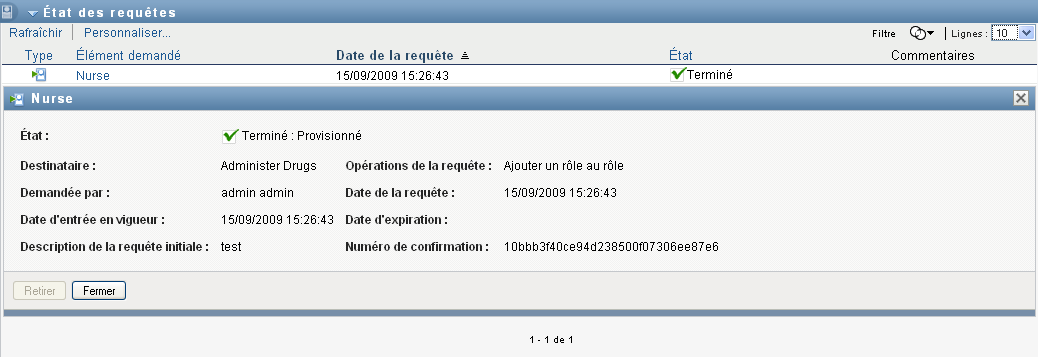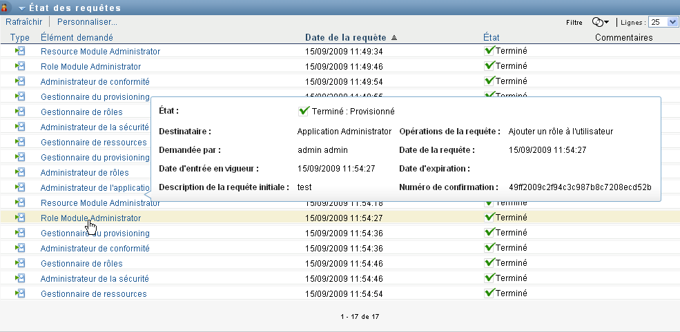 REMARQUE :si l'horloge système du serveur où réside le pilote de service de rôle n'est pas synchronisée avec celle du serveur où l'application utilisateur s'exécute, l'état des requêtes peut être différent sur les listes État des requêtes et Assignations de rôles. Par exemple, si vous effectuez une requête d'assignation de rôle qui ne nécessite pas d'approbation, l'état dans la section État des requêtes peut indiquer Provisionné, alors qu'il est défini sur Activation en attente dans la section Assignations de rôles. Si vous patientez environ une minute, vous constatez que l'état dans la section Assignations de rôles change et devient Provisionné. Pour vous assurer que l'état est affiché correctement dans l'application utilisateur, vérifiez que vos horloges système sont parfaitement synchronisées.