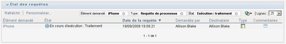 La liste de requêtes s'affiche. Si vous n'êtes pas en mode de gestion, les requêtes affichées sont celles dont vous êtes le receveur ou le demandeur. Si vous êtes en mode de gestion, les requêtes affichées sont celles dont l'utilisateur, le groupe ou le conteneur sélectionné est le receveur ou le demandeur.