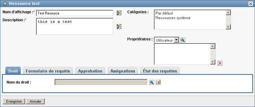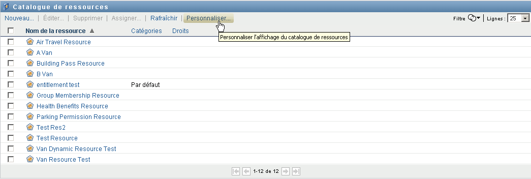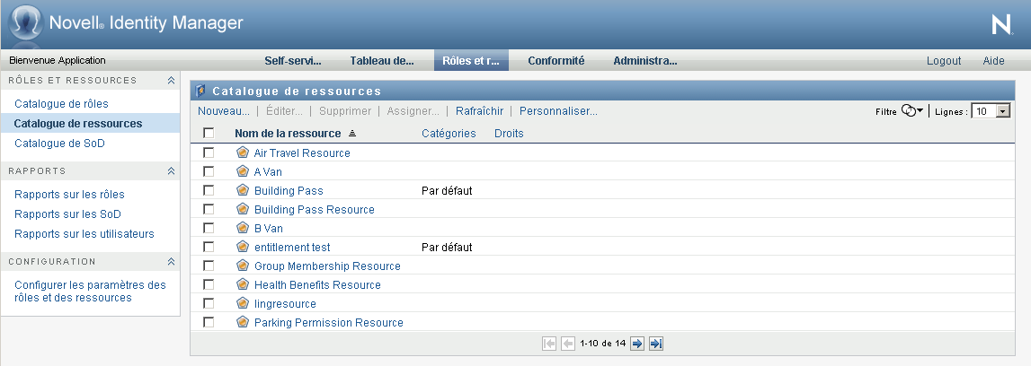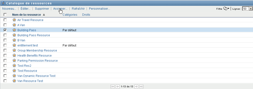 L'opération de l'onglet dans l'interface utilisateur de Identity Manager vous permet d'afficher les ressources précédemment définis dans le catalogue. Elle vous permet également d'en créer des nouvelles ainsi que de modifier, de supprimer et d'assigner des ressources existantes.