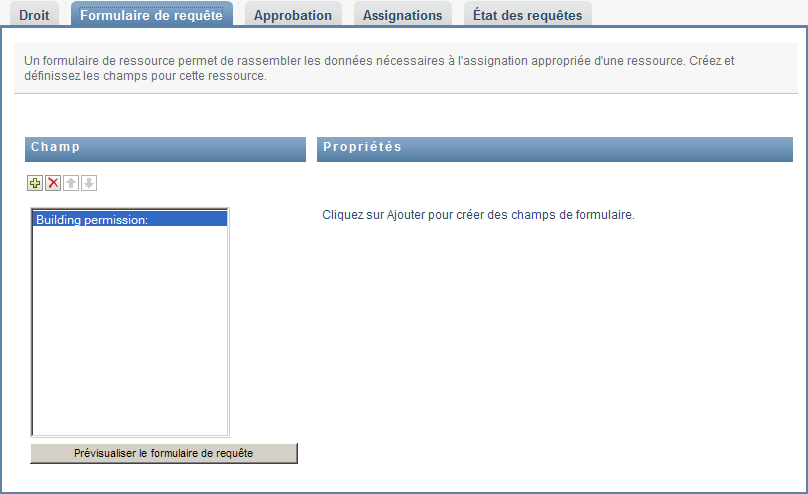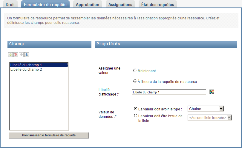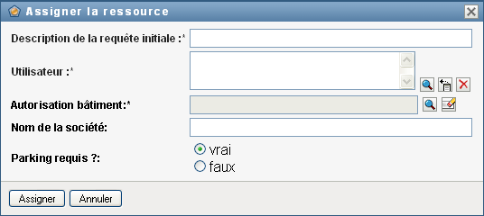 Pour des détails sur l'utilisation du formulaire de requête, reportez-vous à la section Assignation d'une ressource à partir du catalogue.